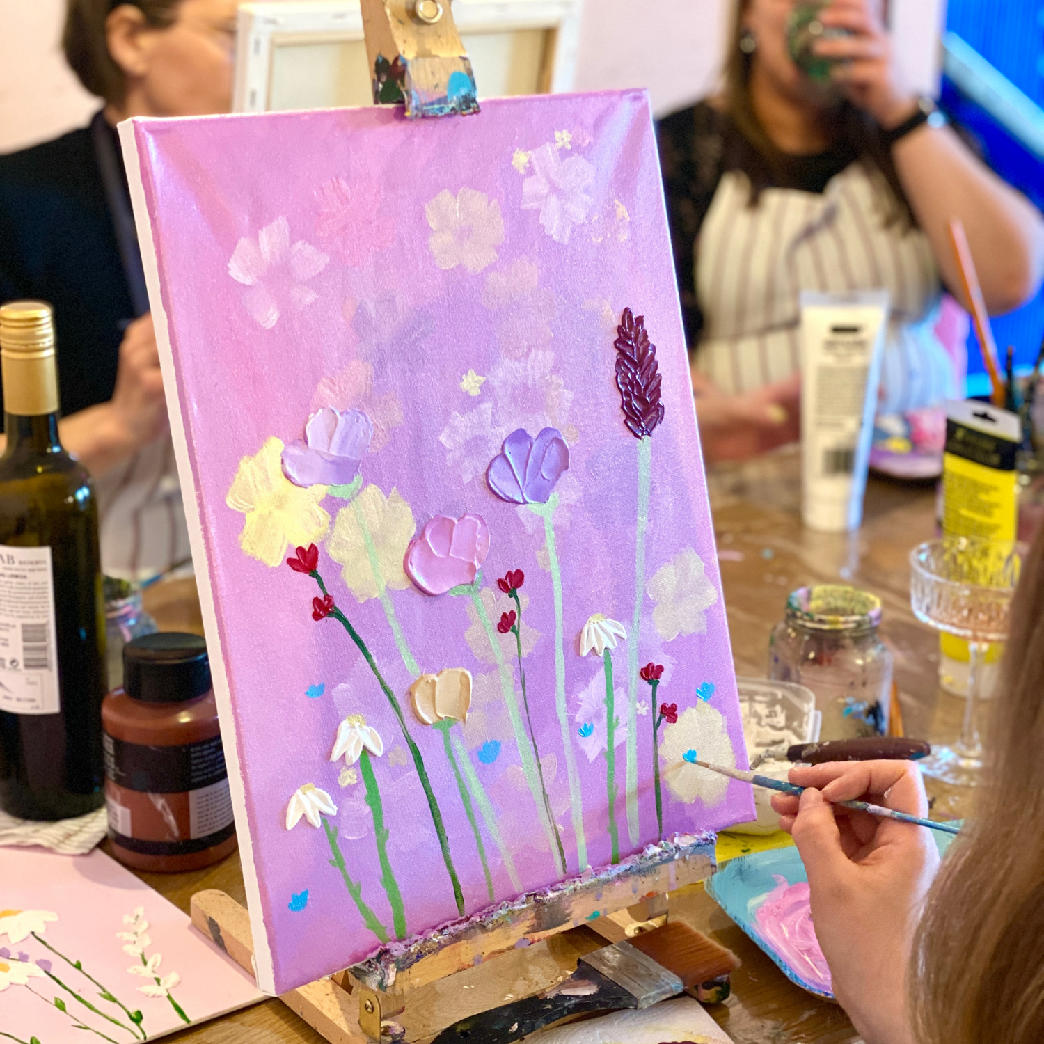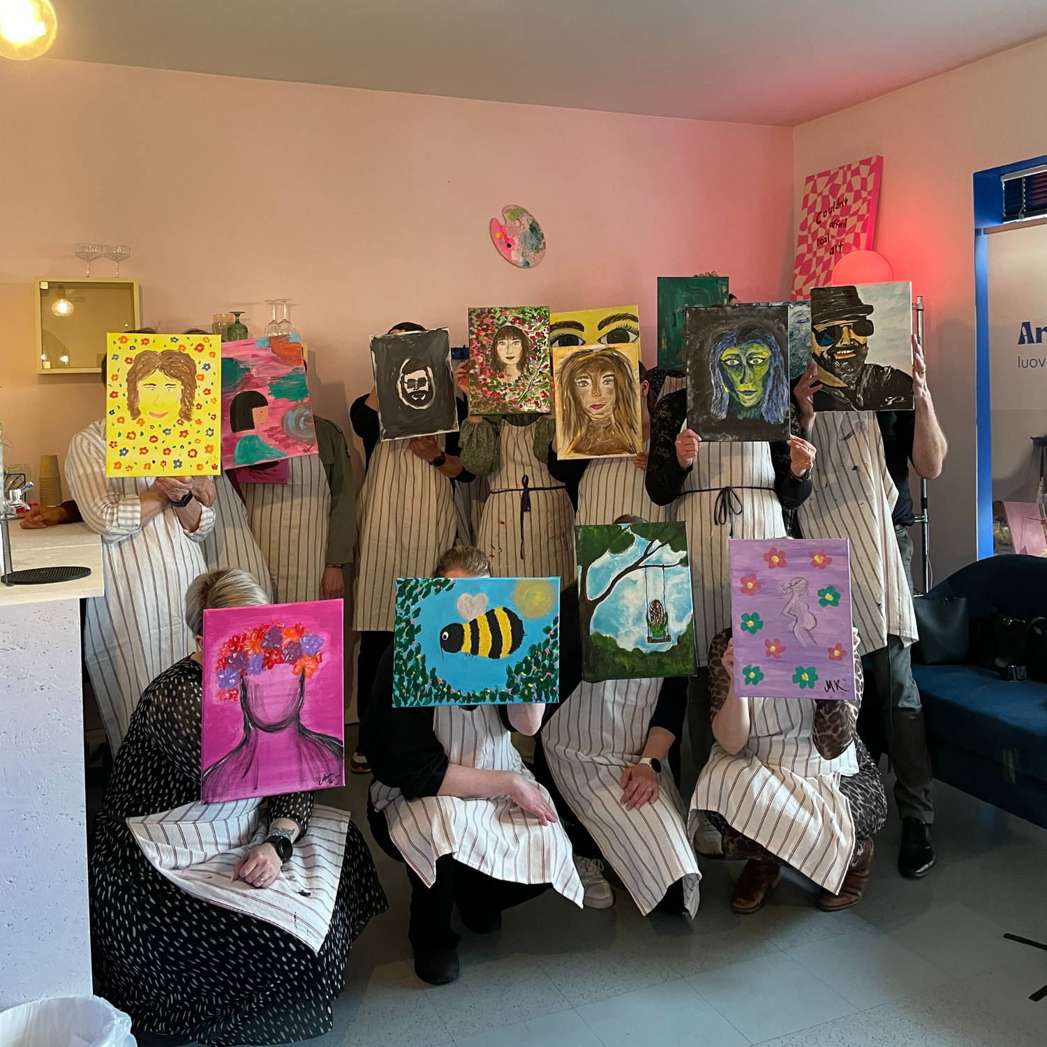 Lipun hintaan sisältyy kaikki tarvikkeet lähtien suojaessusta aina hyvään tunnelmaan! Viini/ juoma tuodaan itse. Maalaamme akryyliväreillä 30 x 40 cm kokoiselle canvaspohjalle ja käytössäsi on värien lisäksi tekstuurimassaa, erilaisia siveltimiä, palettiveitsiä ja muita tarvikkeita. Maalauksen saat lopuksi viedä kotiisi tai lahjoittaa studiolle uusiokäyttöön.