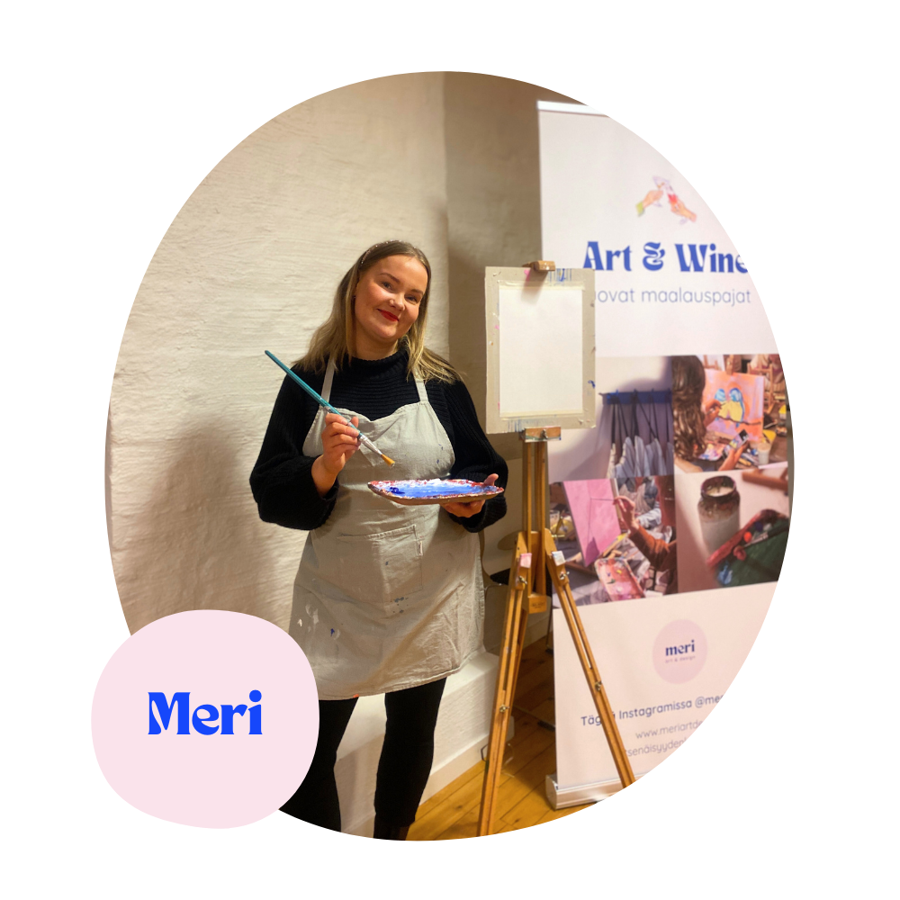 "Heippa! Olen Meri, Luavaamon perustaja ja yrittäjä. Pienenä rakastin piirtää, mutta vasta aikuisiällä löysin siveltimet ja maalin. Rakastan värejä, tekstuureja ja niitä olen myös tuonut maalauspajoihin mukaan. Olen itseoppinut taiteilija ja se on ollut paras mahdollinen reitti tähän hommaan. Jatkuva uteliaana oppiminen on antanut hyvät avaimet ohjaamiselle. Maalauspajoissani voit vaihtaa vapaalle ja takaan, että luomisen lisäksi pääset myös nauramaan!"